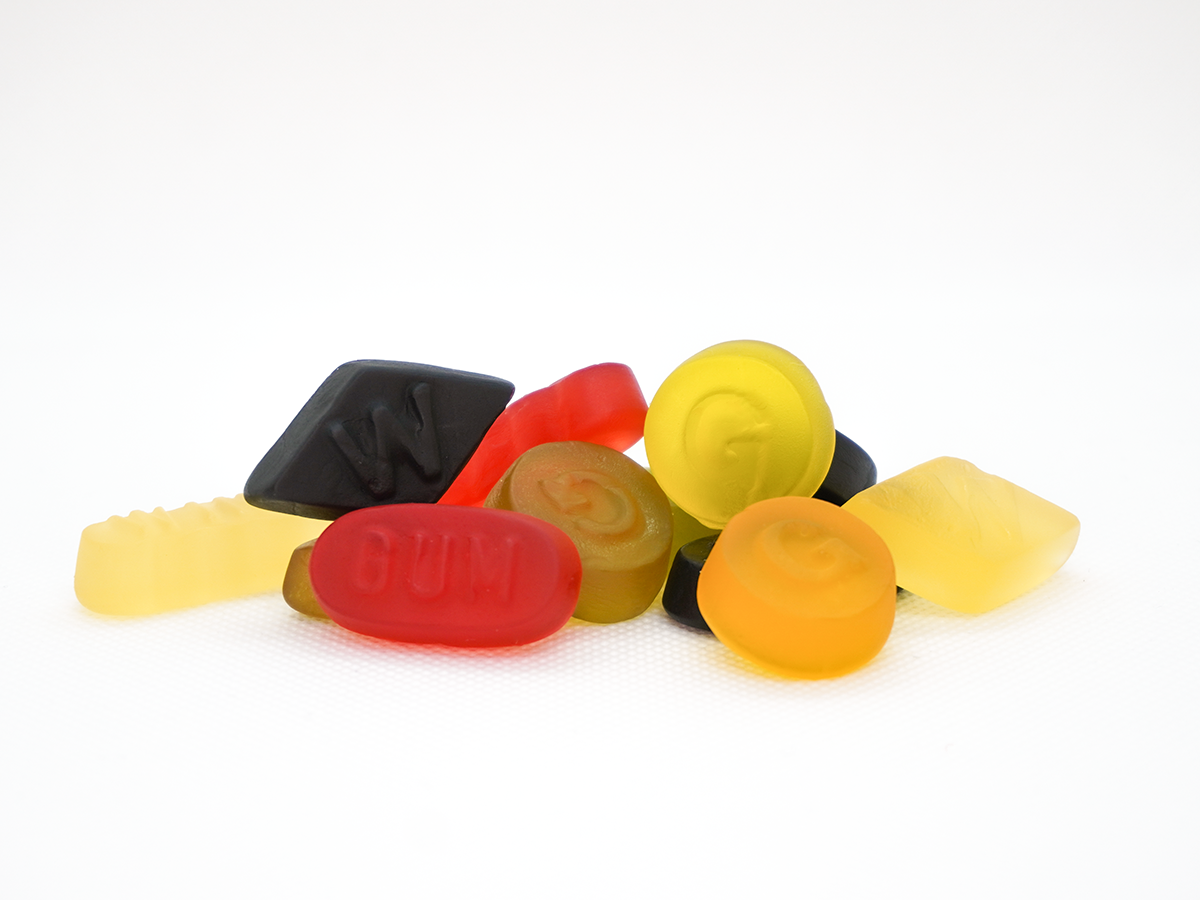 Zutaten: Glukosesirup; Zucker; modifizierte Stärke (Mais, Weizen); Gelatine; Säuerungsmittel: Milchsäure, Essigsäure; Aroma; färbende Lebensmittel (Curcuma, Spirulina, Saflor, Roter Rettich, Rote Traube, Kirsche); Farbstoffe: Echtes Karmin, Pflanzenkohle; Überzugsmittel: Bienenwachs weiß und gelb, Carnaubawachs.