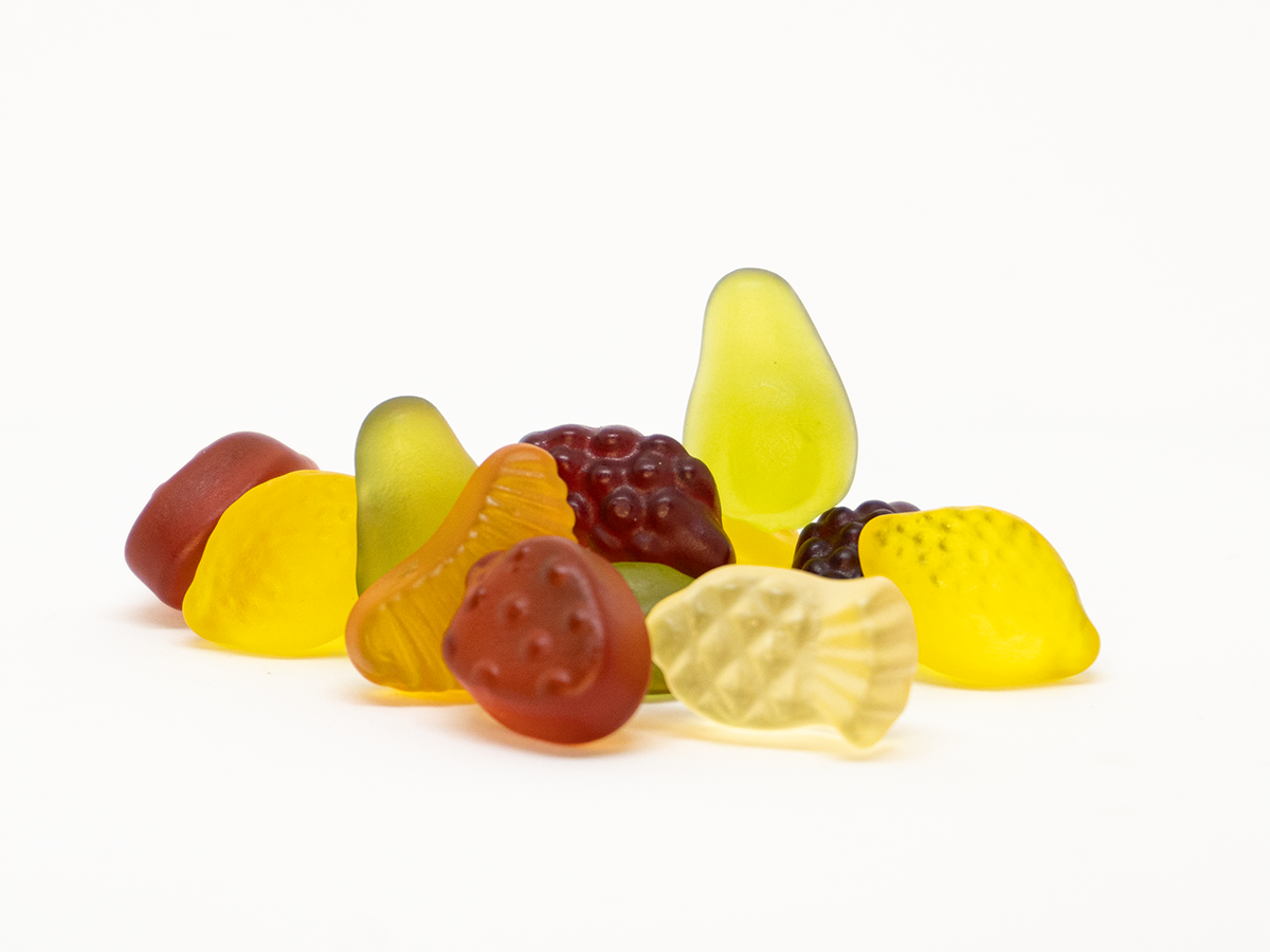 Zutaten: Glukosesirup; Zucker; 14 % Fruchtsaft aus Fruchtsaftkonzentraten (Ananas, Birne, Erdbeere, Orange, Schwarze Johannisbeere, Zitrone); Geliermittel: Pektin; Säuerungsmittel: Citronensäure; natürliche Aromen; färbende Lebensmittel (Schwarze Johannisbeere, Schwarze Karotte, Spirulina, Saflor, Curcuma, Roter Rettich, Rote Traube, Kirsche, Holunder); Überzugsmittel: Carnaubawachs. Kann Spuren von Bienenwachs enthalten.