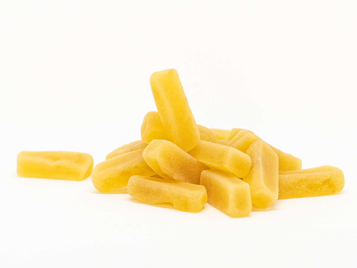 Zutaten: Zucker; Glukosesirup; 7 % Ingwerpulpe; Gelatine; Säuerungsmittel: Citronensäure; Ingwerextrakt; Aroma; färbende Lebensmittel (Karamellzuckersirup); Überzugsmittel: Bienenwachs weiß und gelb, Carnaubawachs.